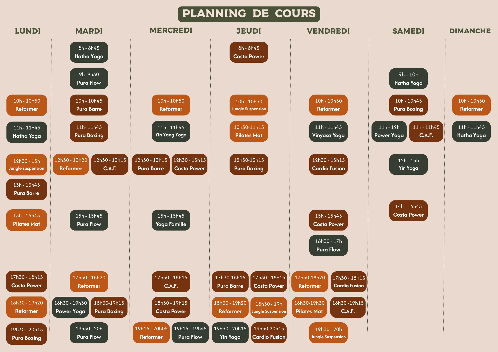 - Posture & Stabilité : Pilates Reformer, Pilates Débutant, Pilates Intermédiaire, Jungle Suspension